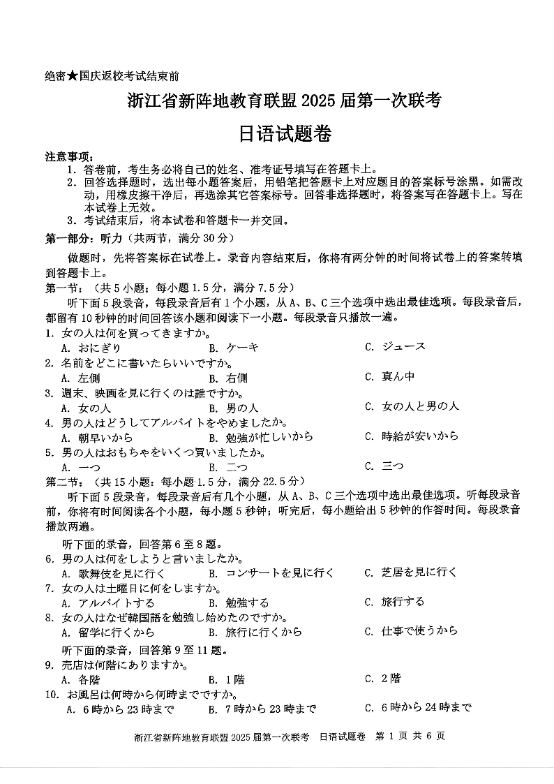 浙江省新阵地2025届第一次联考试卷