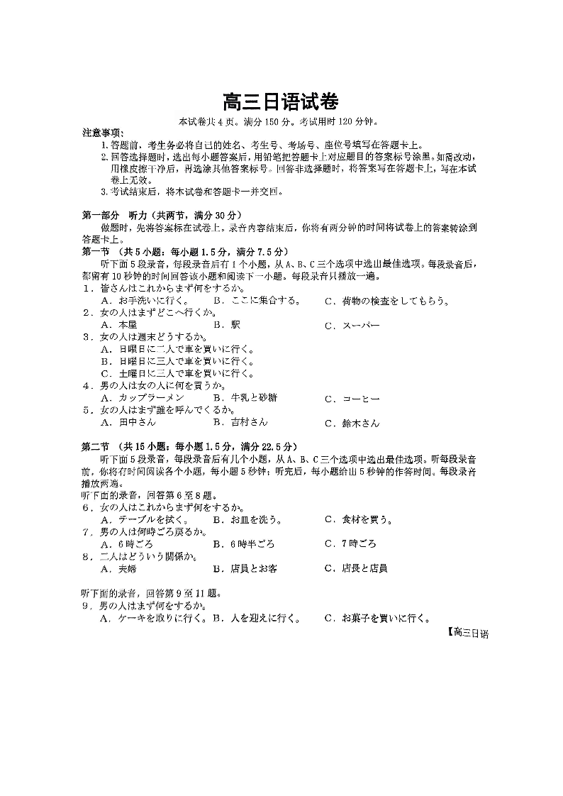 高三上学期10月联考日语【试题】25-X2