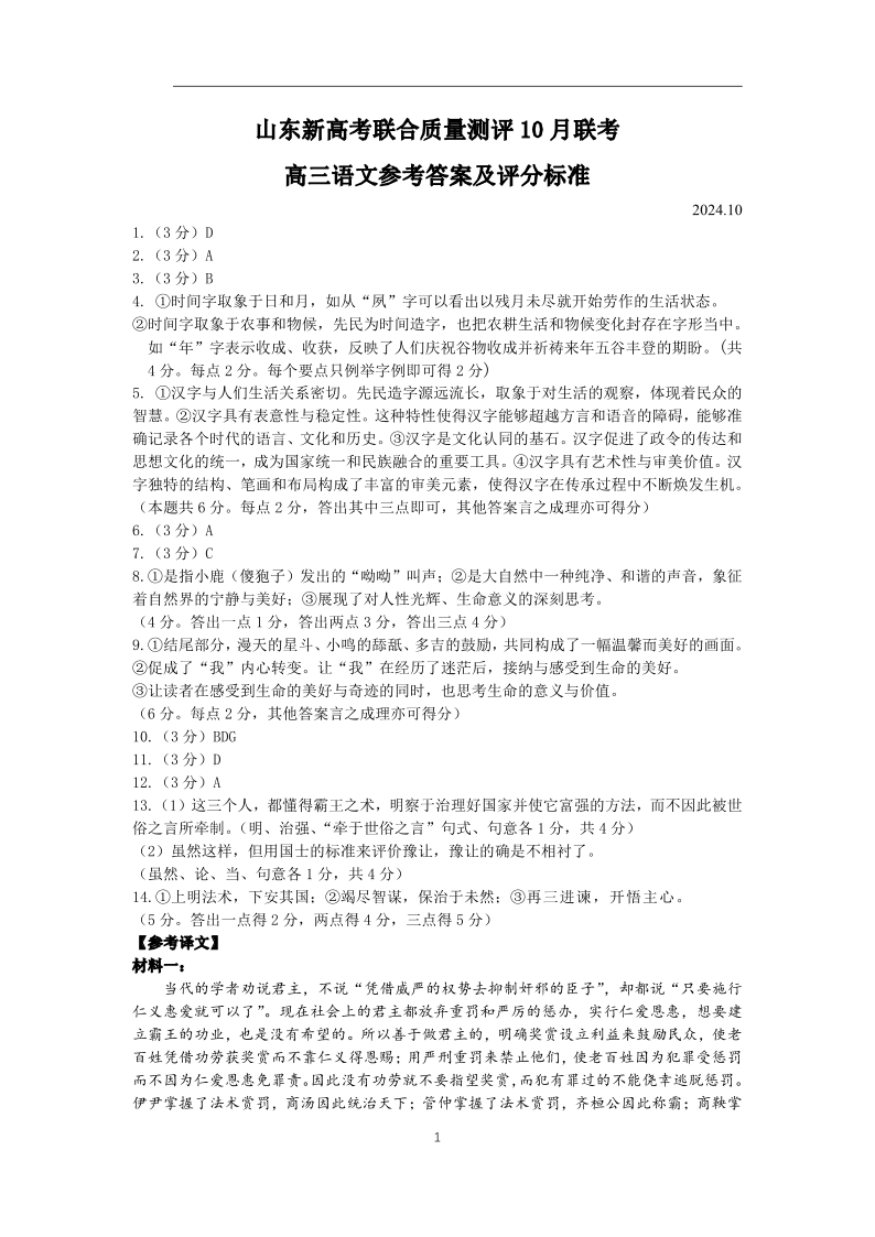 山东新高考联合质量测评高三10月联考试题+语文答案