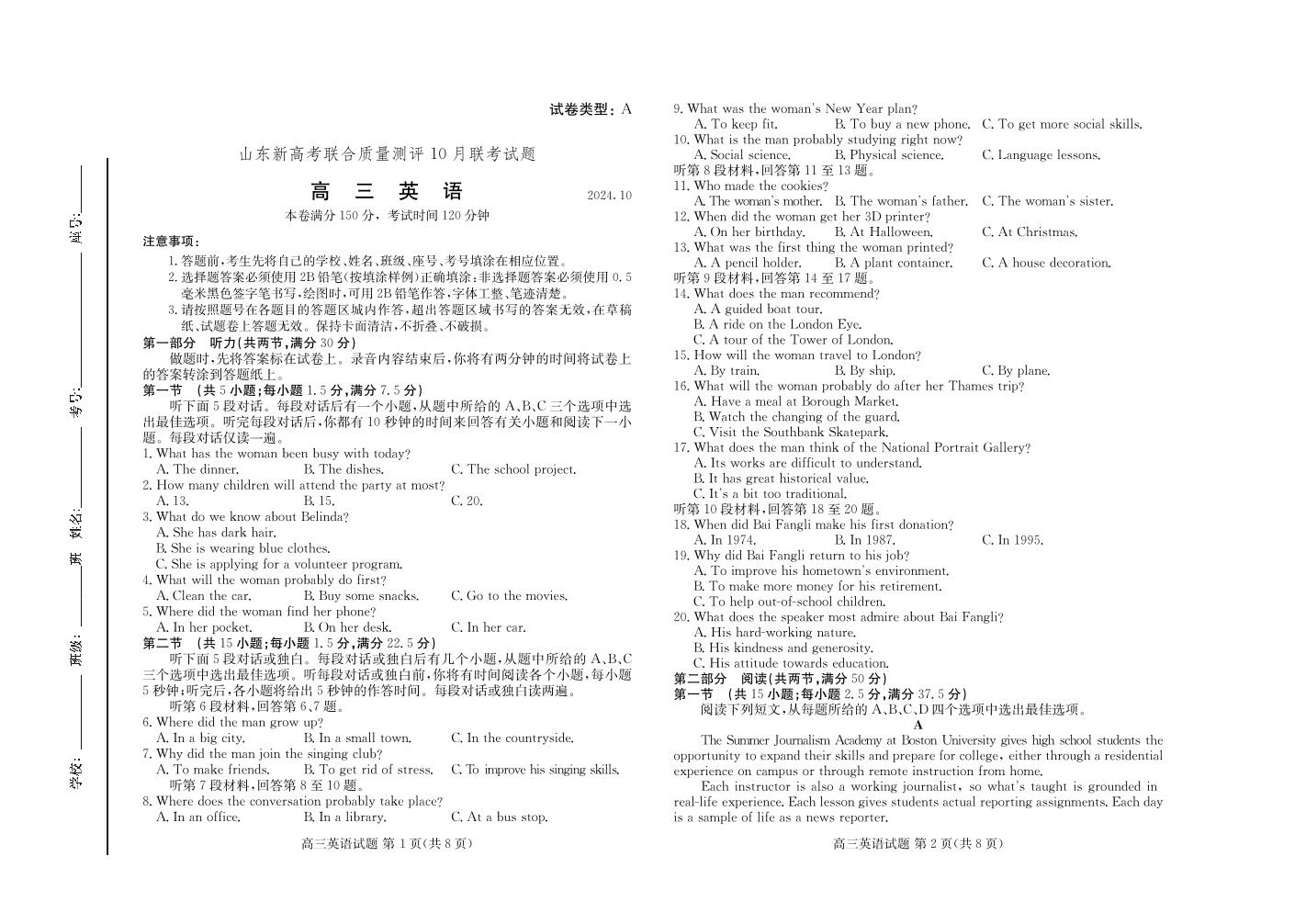 山东新高考联合质量测评高三10月联考试题+英语