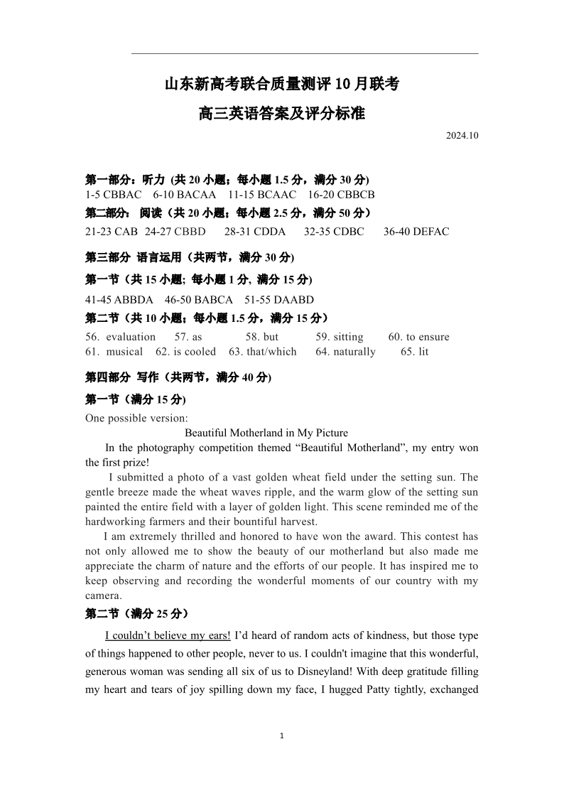 山东新高考联合质量测评高三10月联考试题+英语答案