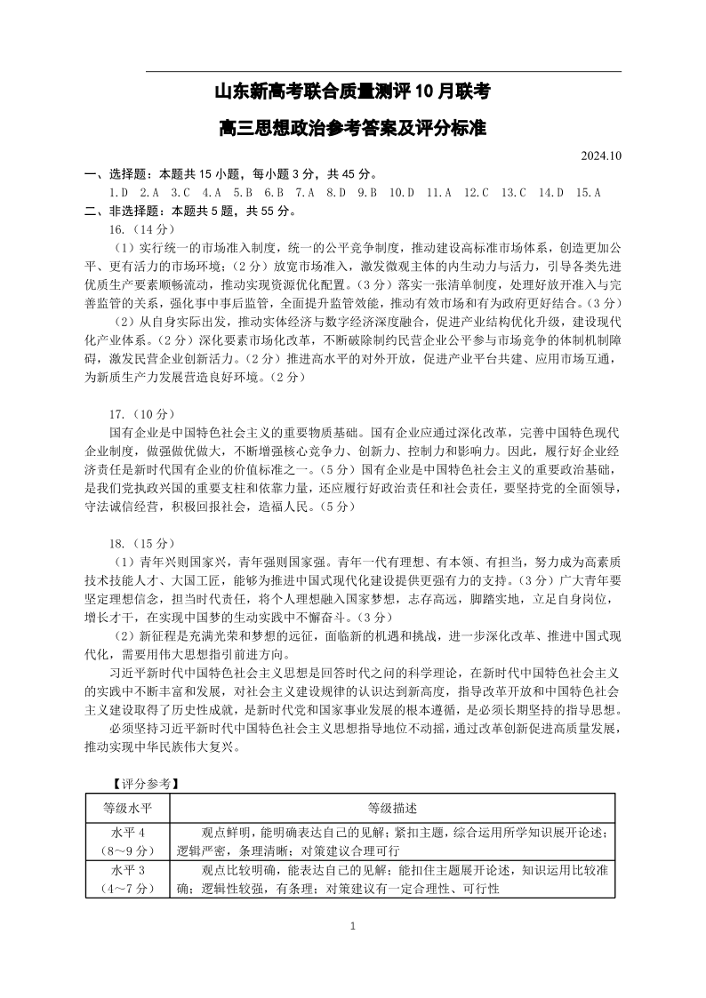 山东新高考联合质量测评高三10月联考试题+政治答案