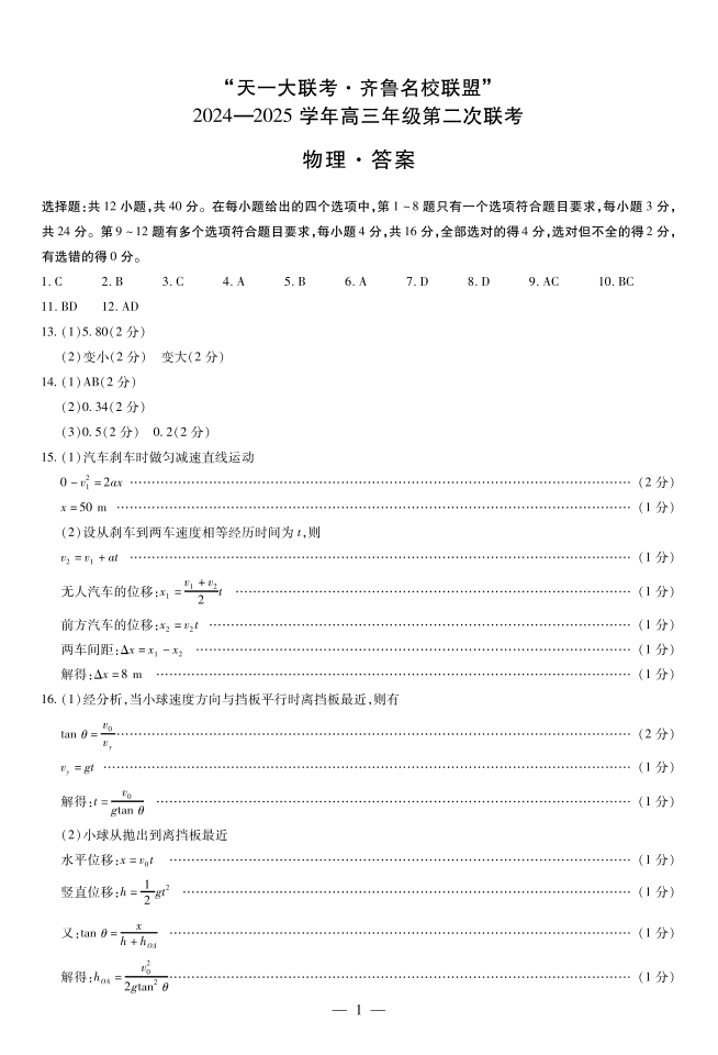 山东省齐鲁名校2024-2025学年高三年级第二次联考+物理答案