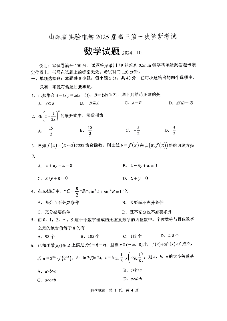 山东省实验中学2025届高三第一次诊断考试+数学