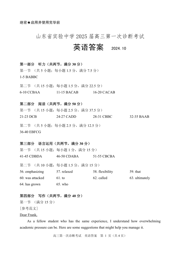 山东省实验中学2025届高三第一次诊断考试+英语答案