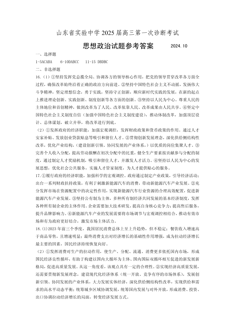 山东省实验中学2025届高三第一次诊断考试+政治答案