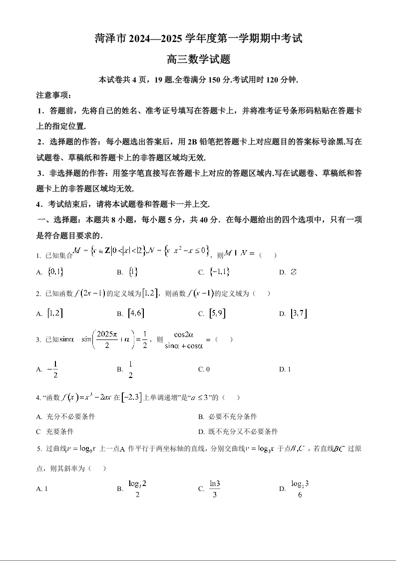 菏泽市2024-2025学年度第一学期期中考试+数学
