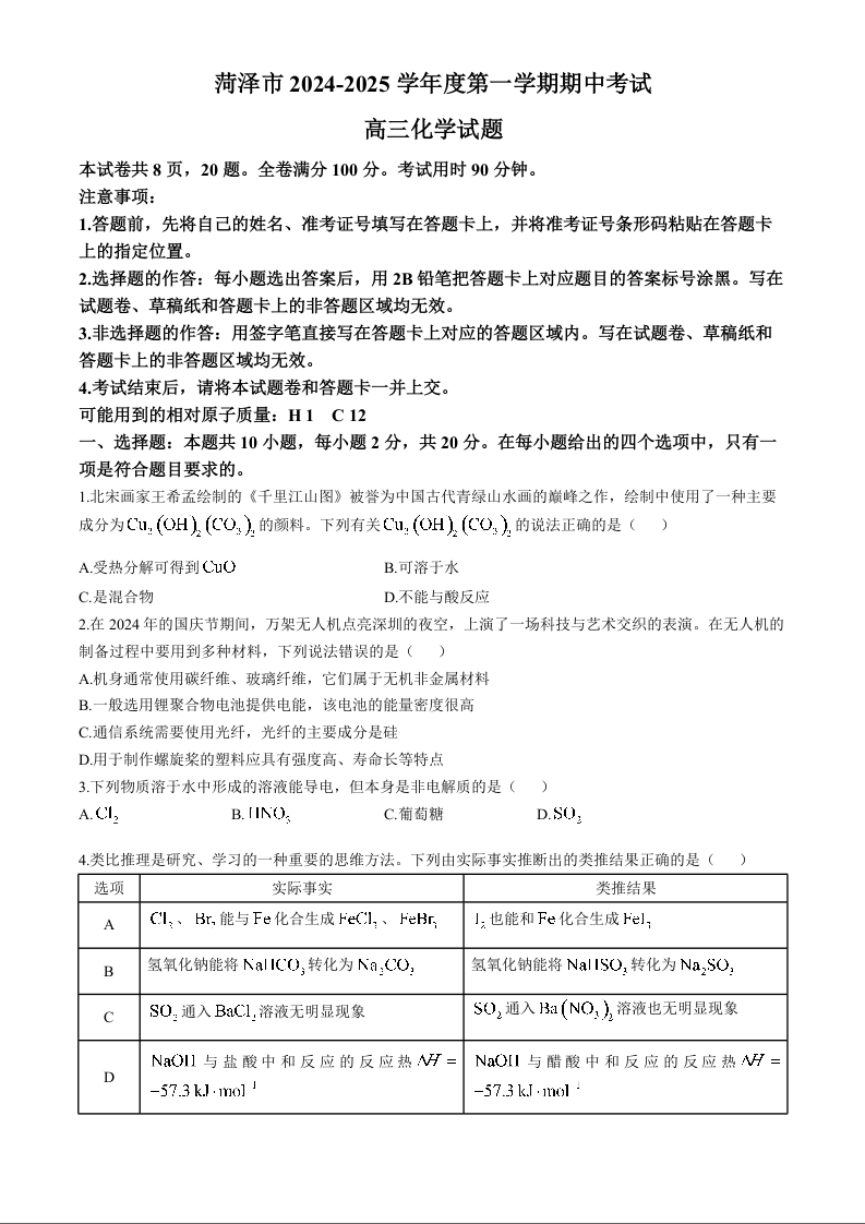 菏泽市2024-2025学年度第一学期期中考试+化学
