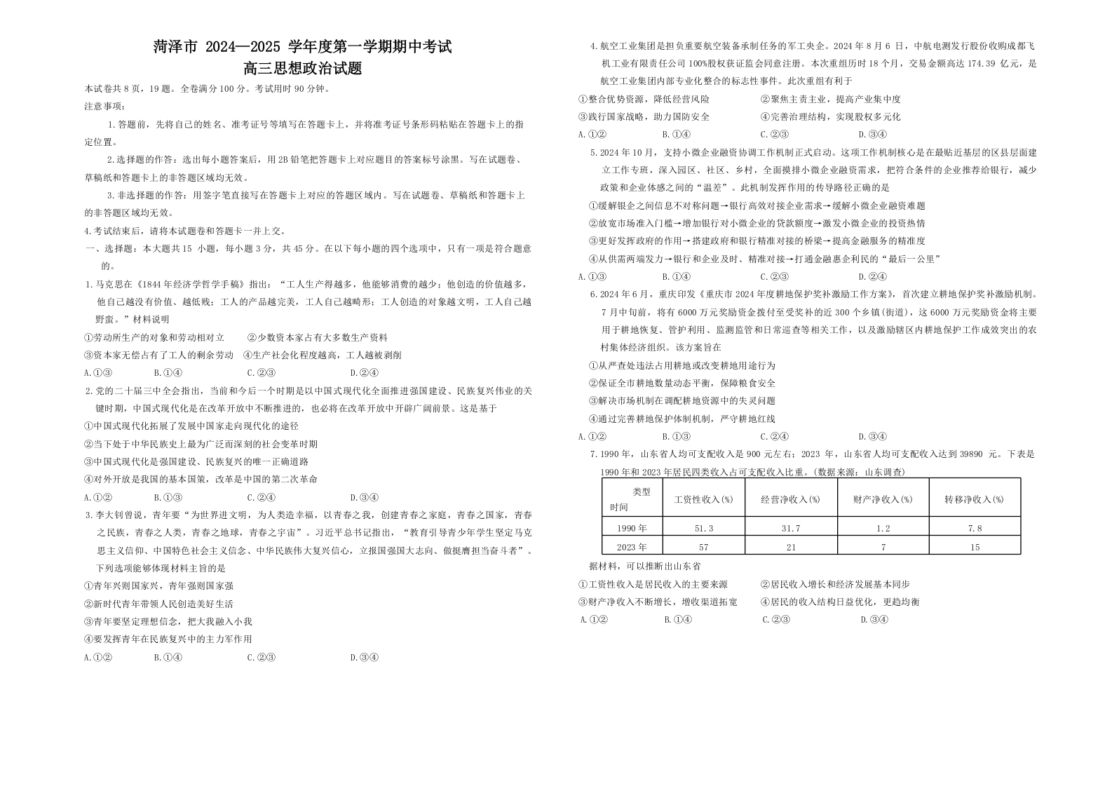 菏泽市2024-2025学年度第一学期期中考试+政治