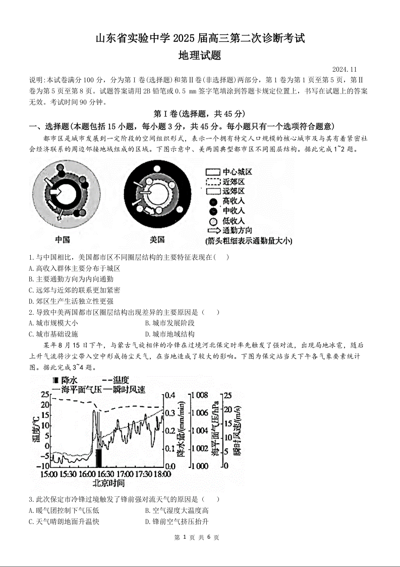 山东省实验中学2025届高三上学期11月期中考试地理及参考答案