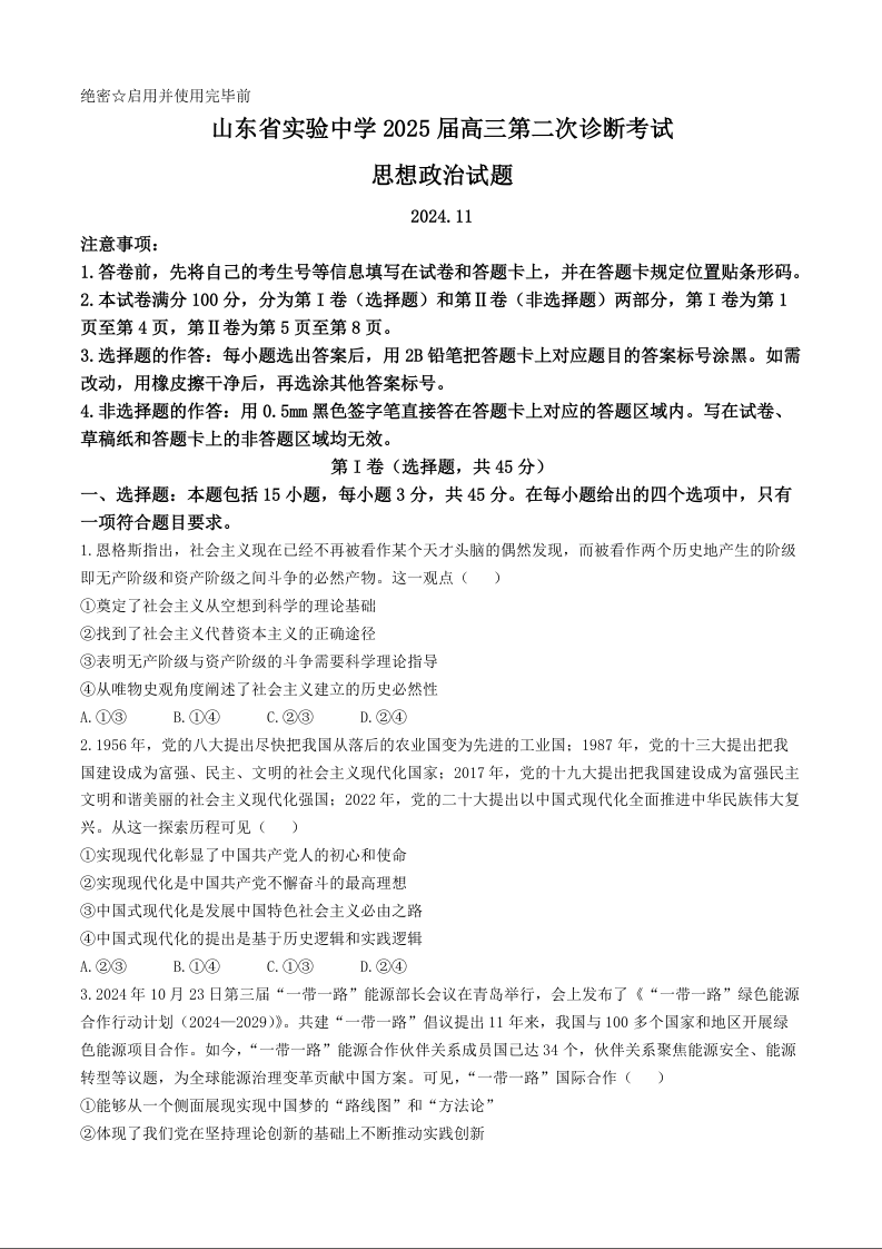山东省实验中学2025届高三上学期11月期中考试政治及参考答案