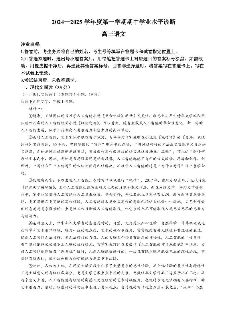 山东省烟台市2024-2025学年度第一学期期中学业水平诊断+语文