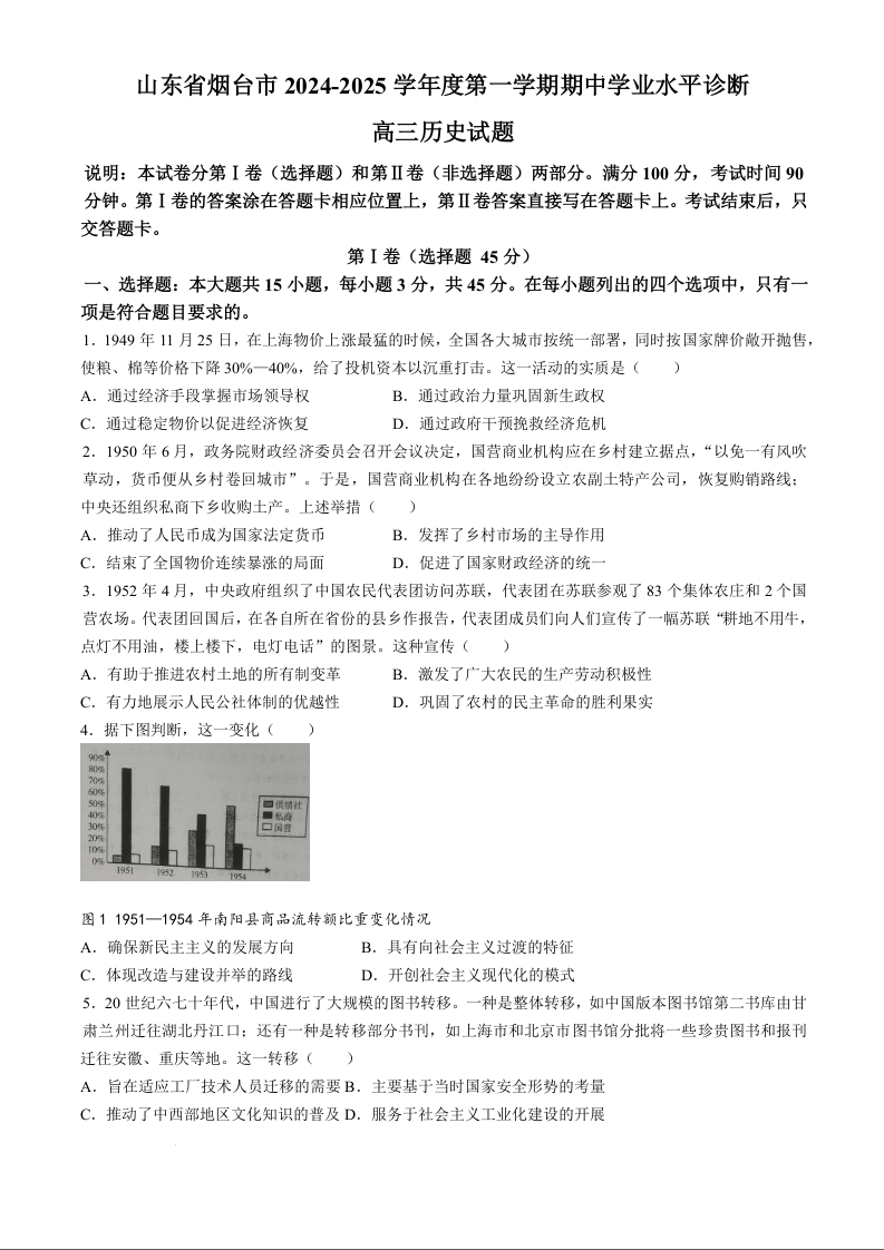 山东省烟台市2024-2025学年度第一学期期中学业水平诊断+历史