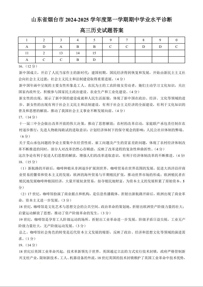 山东省烟台市2024-2025学年度第一学期期中学业水平诊断+历史答案