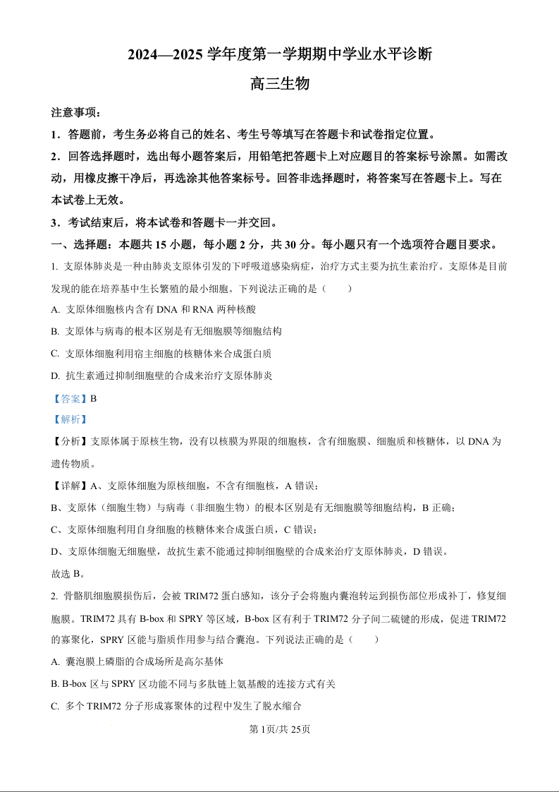 山东省烟台市2024-2025学年度第一学期期中学业水平诊断+生物答案