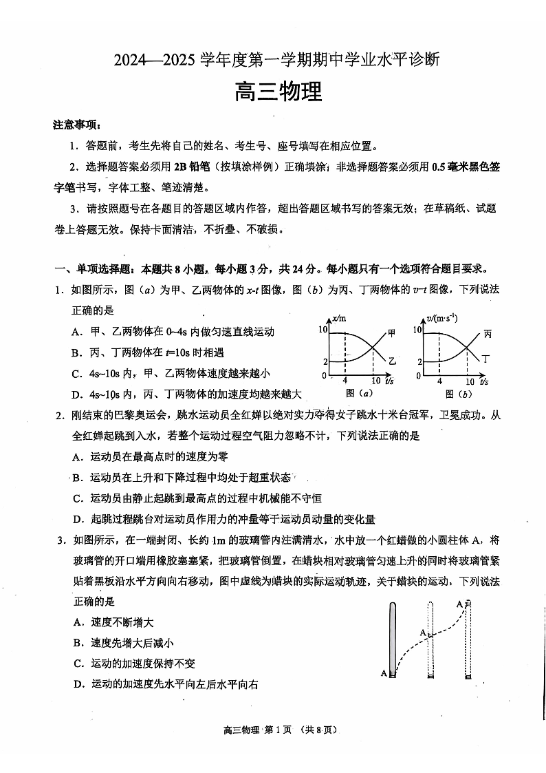 山东省烟台市2024-2025学年度第一学期期中学业水平诊断+物理