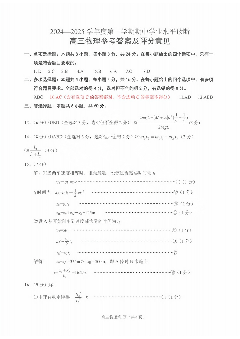 山东省烟台市2024-2025学年度第一学期期中学业水平诊断+物理答案