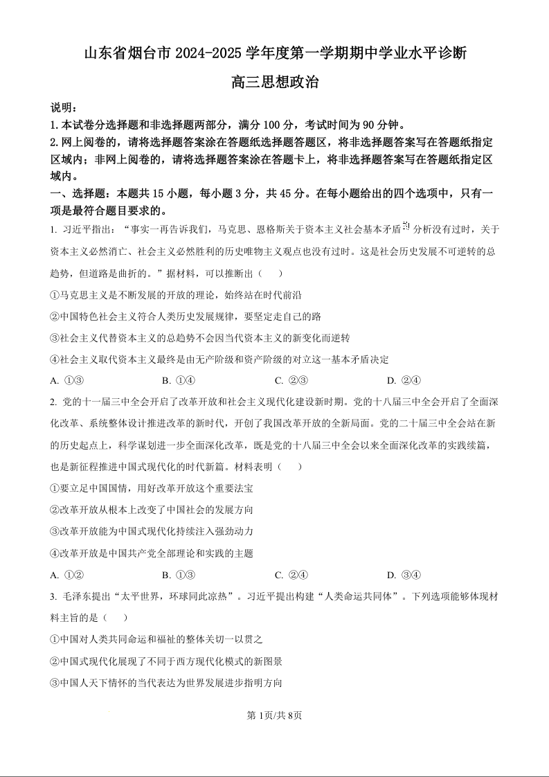 山东省烟台市2024-2025学年度第一学期期中学业水平诊断+政治