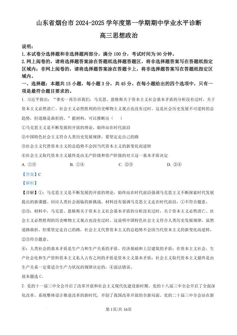山东省烟台市2024-2025学年度第一学期期中学业水平诊断+政治答案