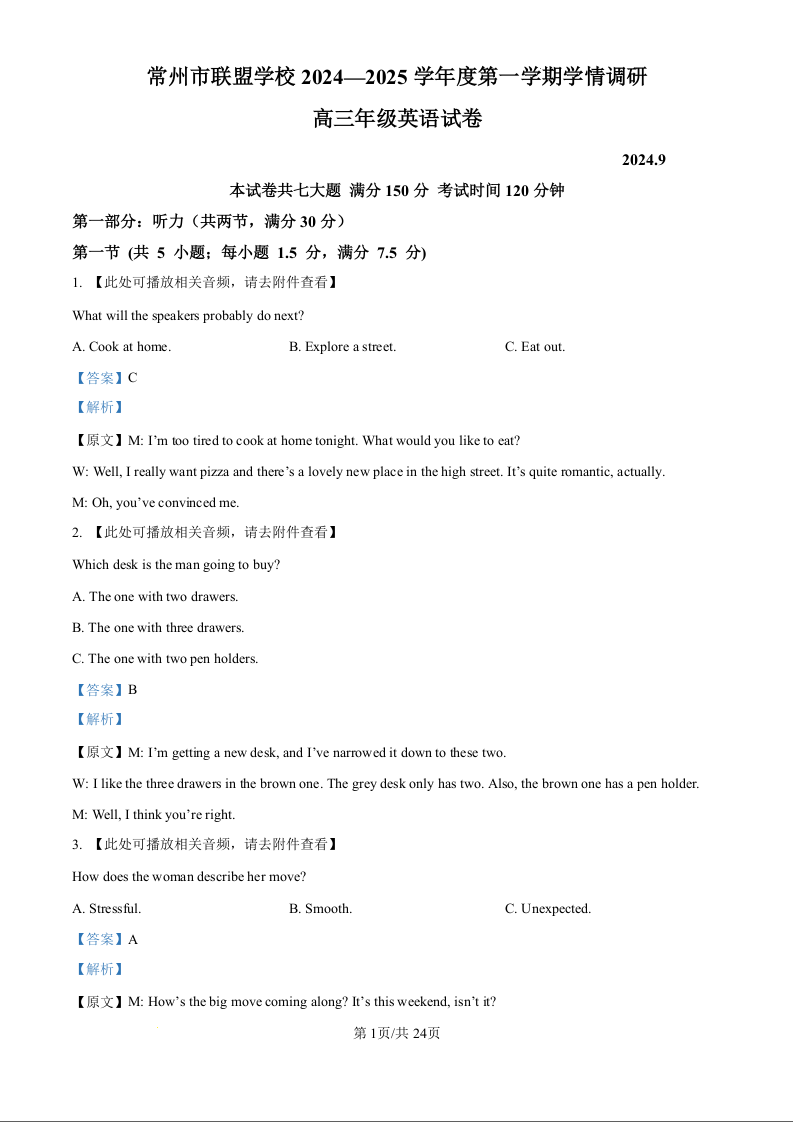 江苏省常州市联盟学校2025届高三上学期10月月考+英语答案