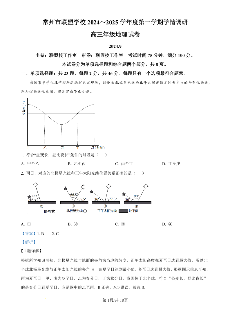 江苏省常州市联盟学校2025届高三上学期10月月考+地理答案