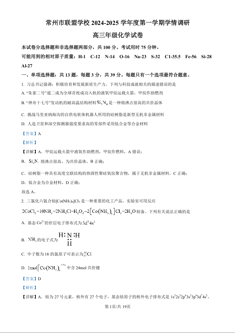 江苏省常州市联盟学校2025届高三上学期10月月考+化学答案
