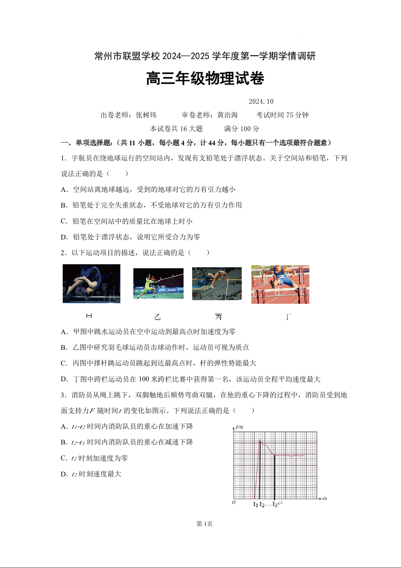 江苏省常州市联盟学校2025届高三上学期10月月考+物理