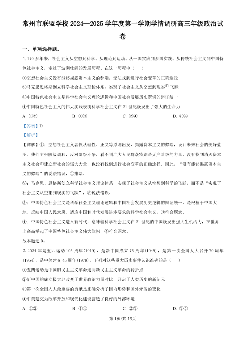 江苏省常州市联盟学校2025届高三上学期10月月考+政治答案