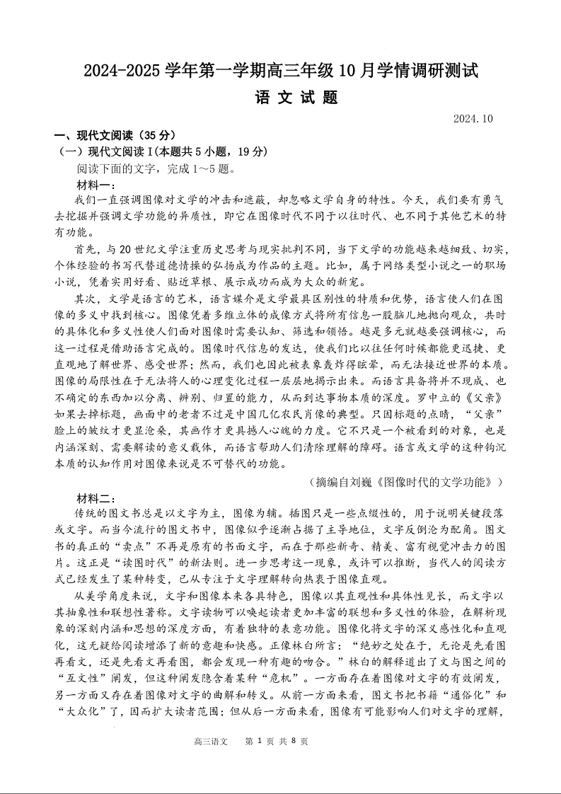 江苏省高邮市2025届高三上学期10月学情调研测试+语文