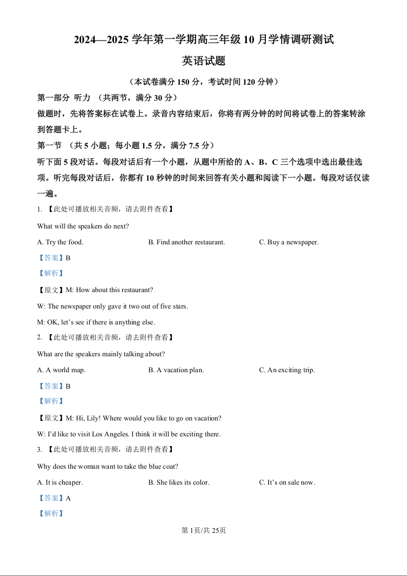 江苏省高邮市2025届高三上学期10月学情调研测试+英语答案