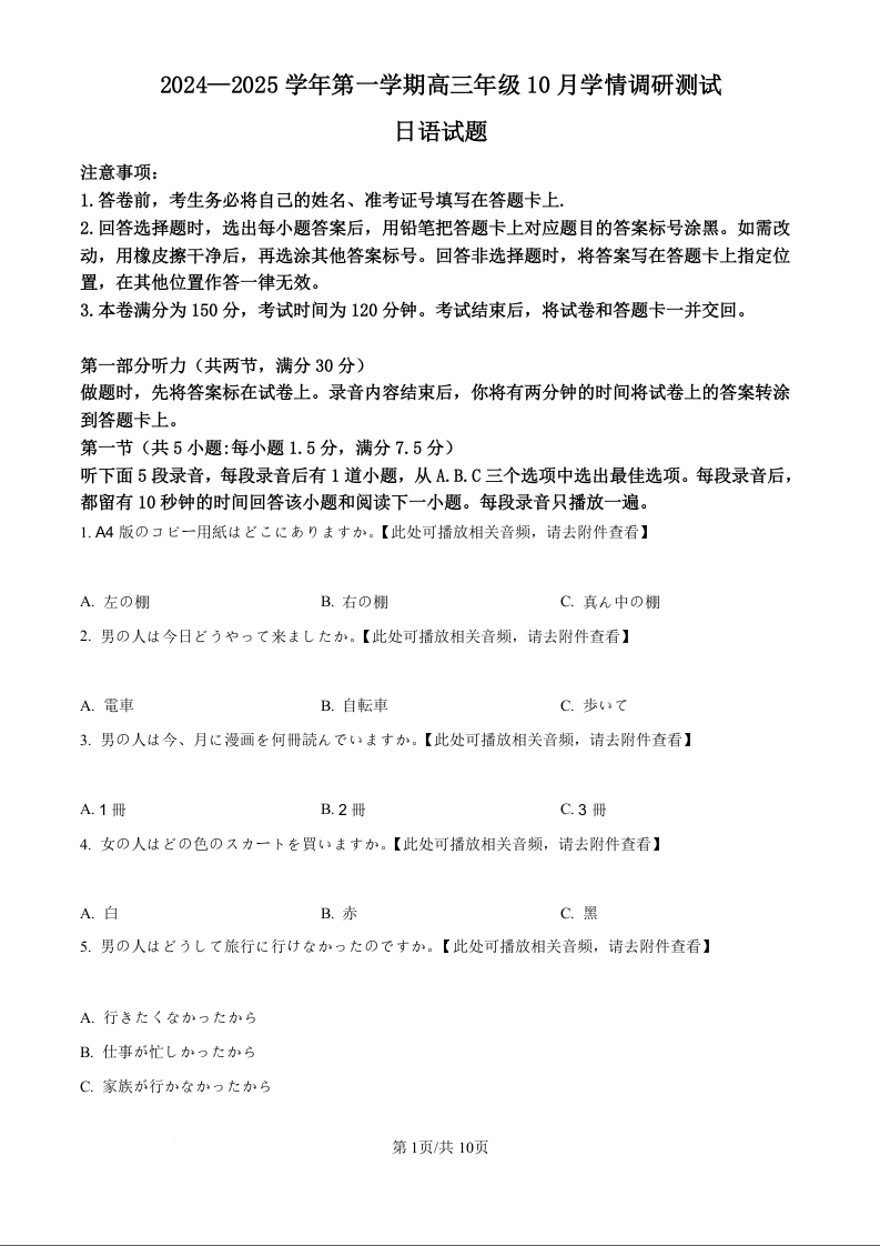江苏省高邮市2025届高三上学期10月学情调研测试+日语