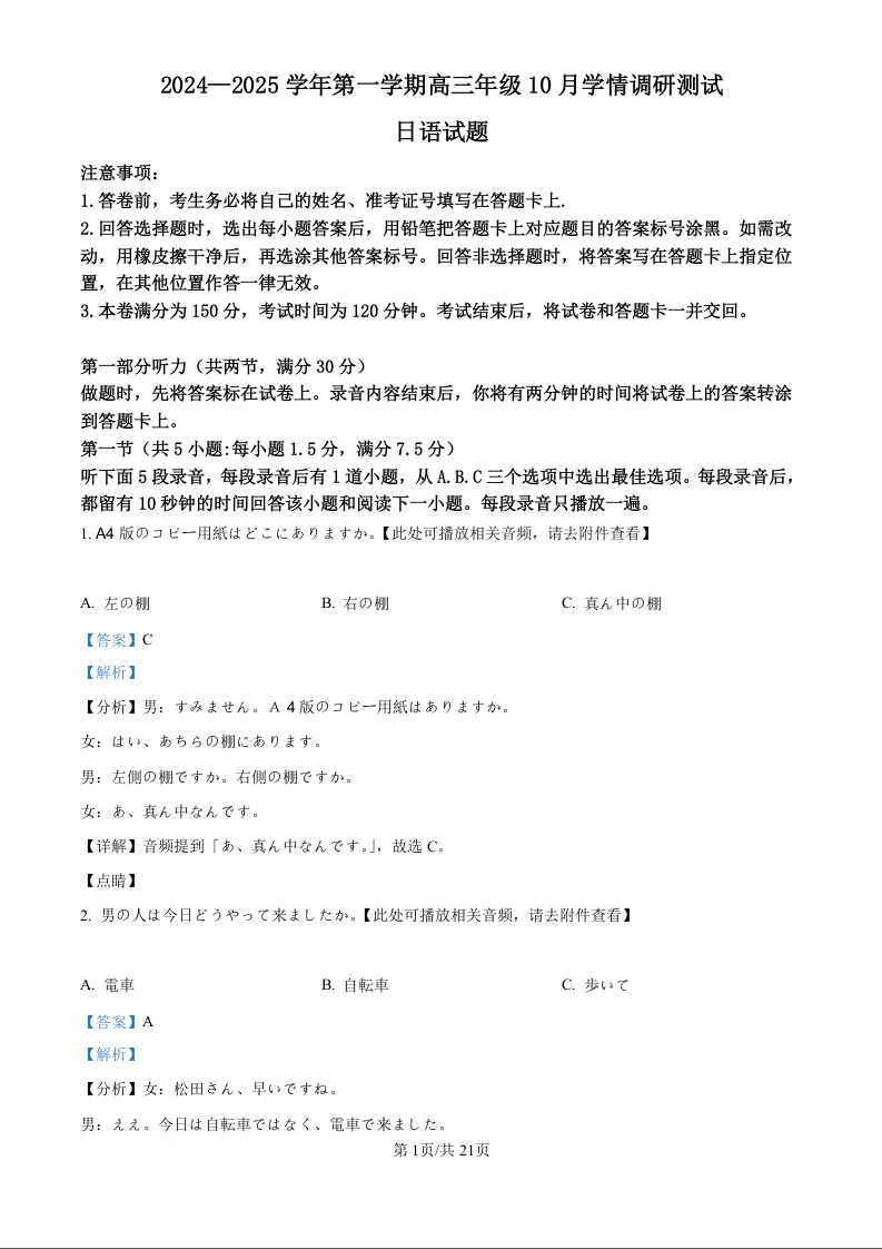 江苏省高邮市2025届高三上学期10月学情调研测试+日语答案