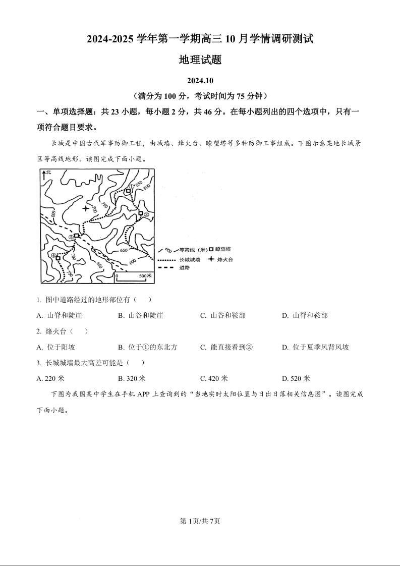 江苏省高邮市2025届高三上学期10月学情调研测试+地理