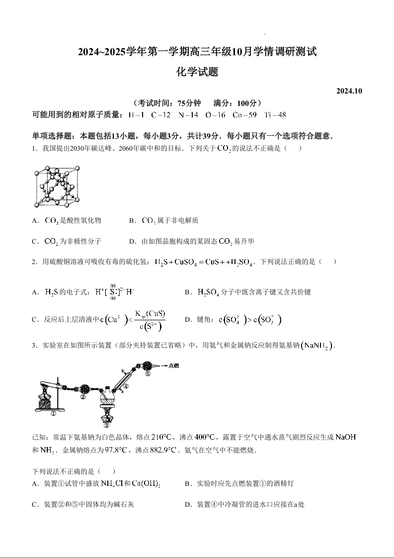 江苏省高邮市2025届高三上学期10月学情调研测试+化学