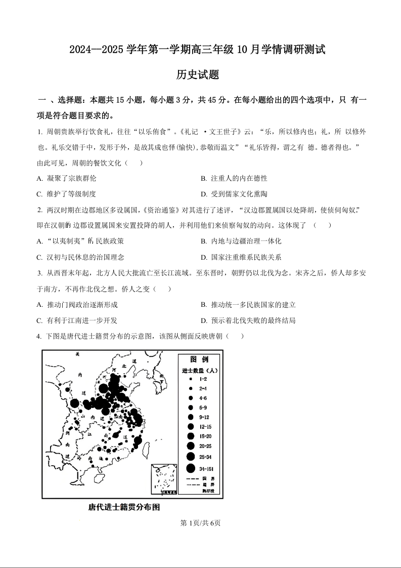 江苏省高邮市2025届高三上学期10月学情调研测试+历史