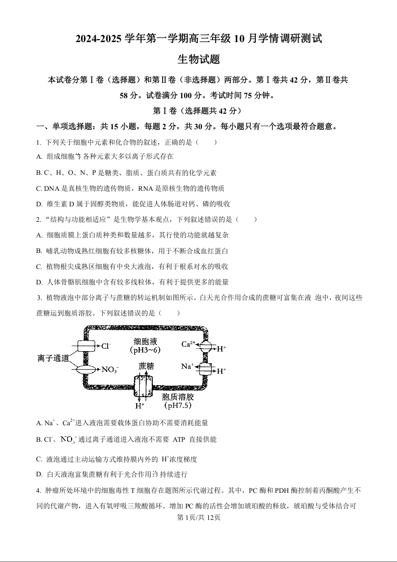 江苏省高邮市2025届高三上学期10月学情调研测试+生物