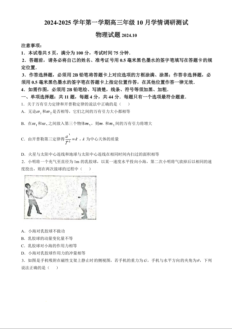 江苏省高邮市2025届高三上学期10月学情调研测试+物理