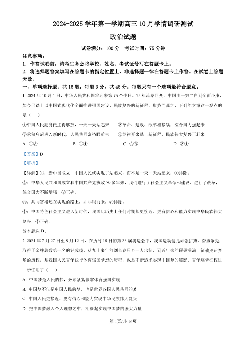 江苏省高邮市2025届高三上学期10月学情调研测试+政治答案