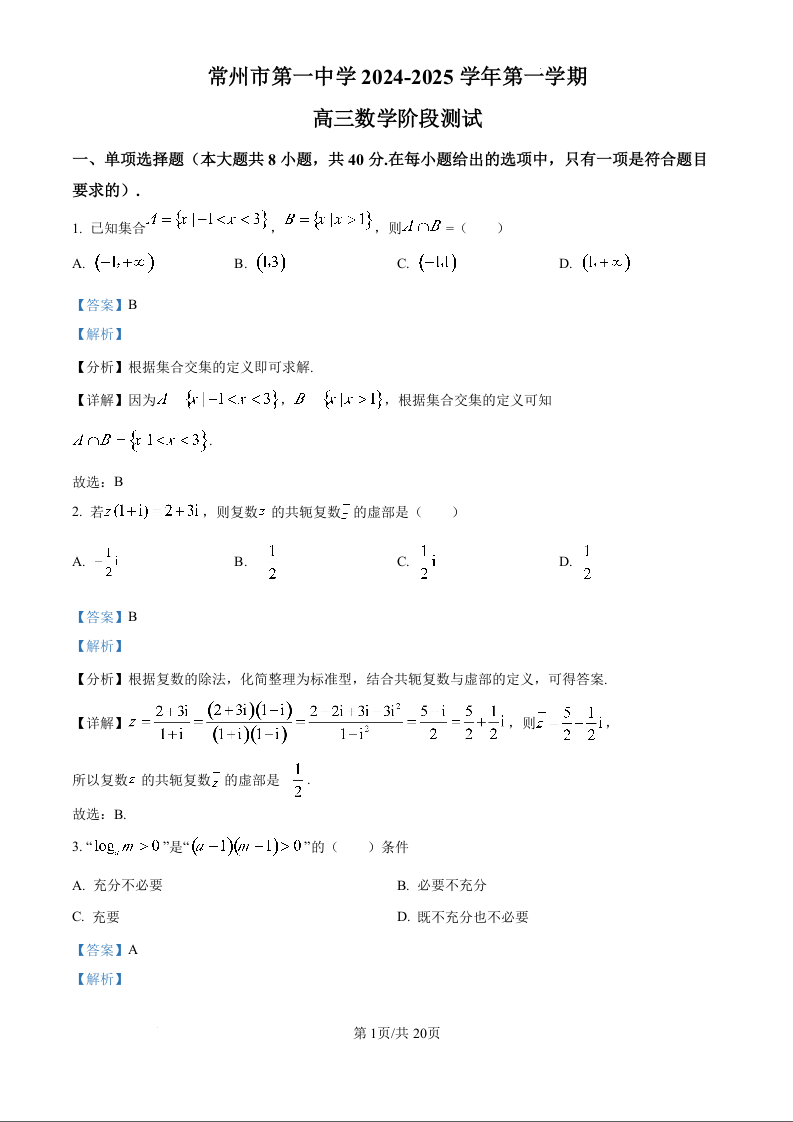 常州市第一中学2024-2025学年第一学期10月阶段测试+数学答案