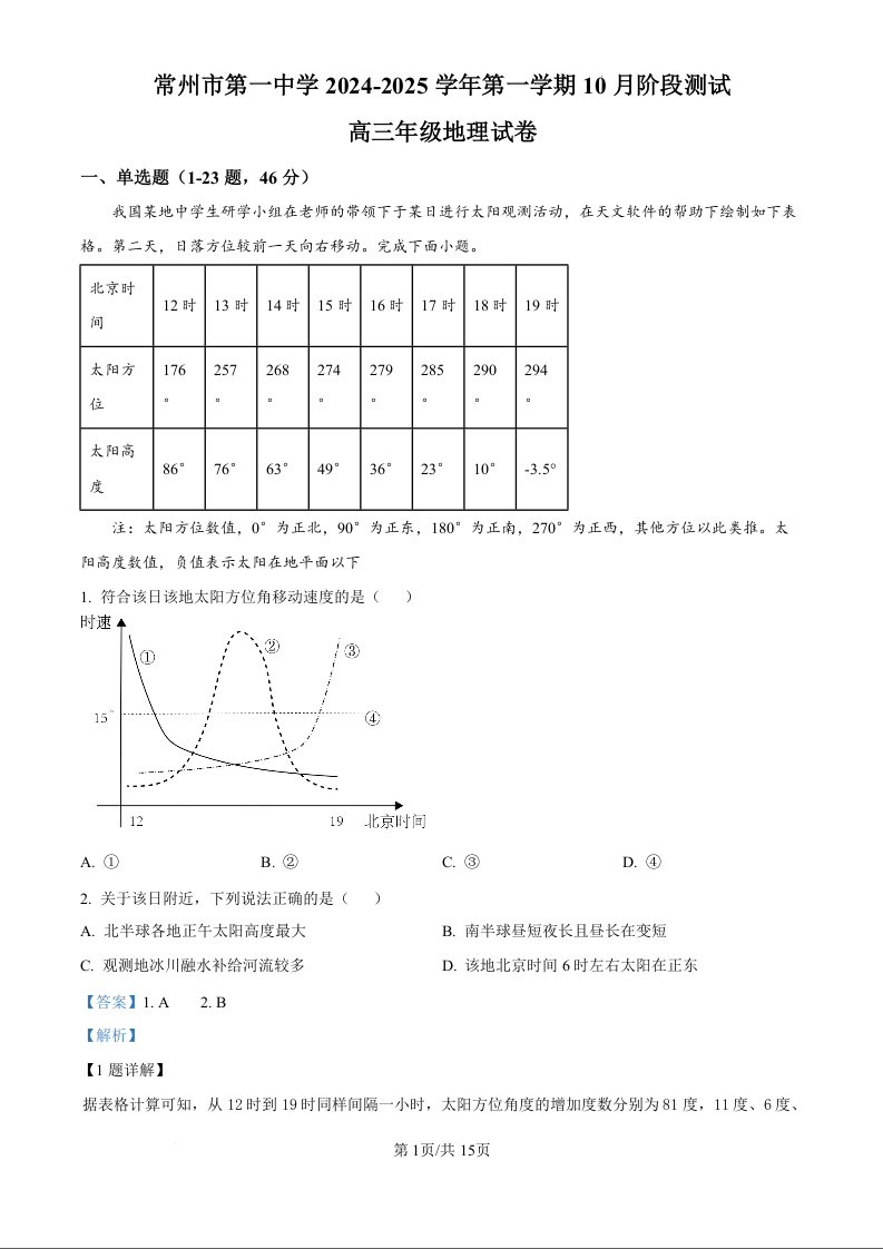 常州市第一中学2024-2025学年第一学期10月阶段测试+地理答案