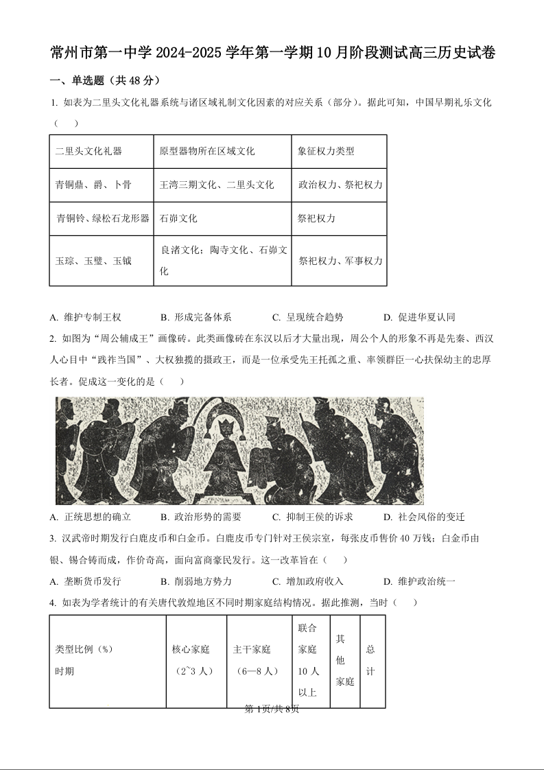 常州市第一中学2024-2025学年第一学期10月阶段测试+历史