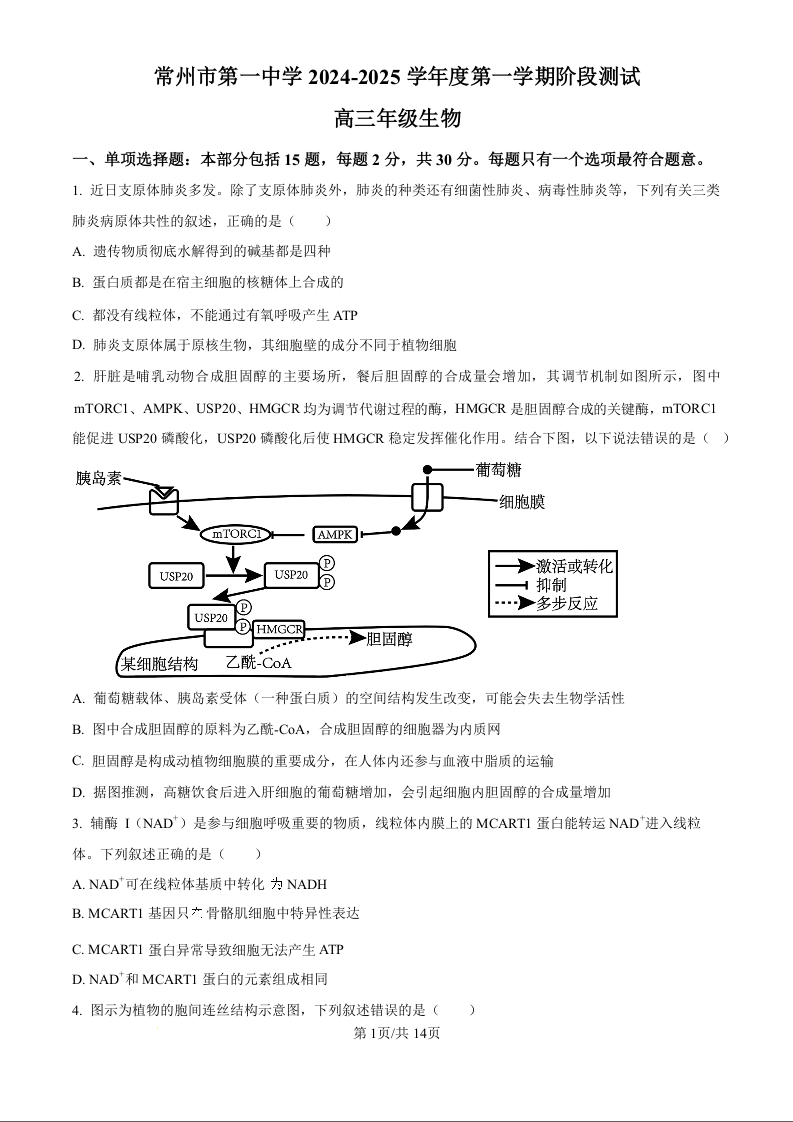 常州市第一中学2024-2025学年第一学期10月阶段测试+生物