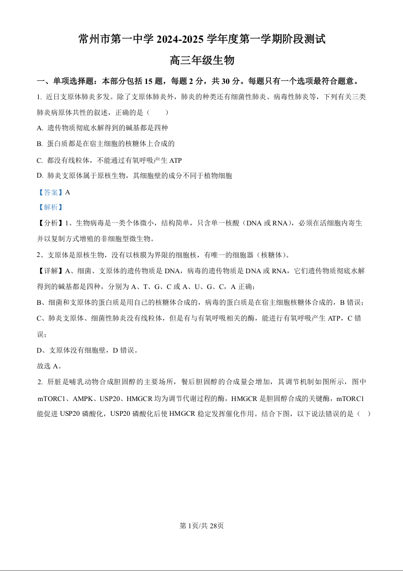 常州市第一中学2024-2025学年第一学期10月阶段测试+生物答案