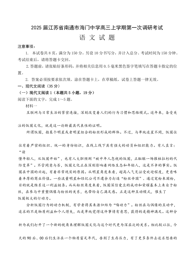 南通海门中学2025届高三上学期第一次调研考试+语文