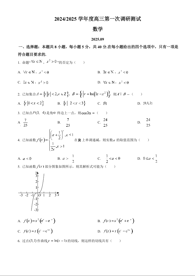 南通海门中学2025届高三上学期第一次调研考试+数学