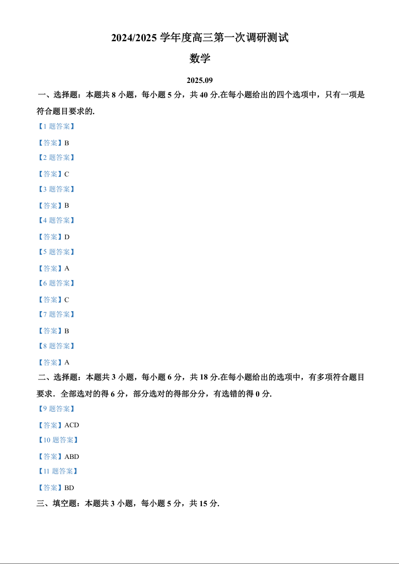 南通海门中学2025届高三上学期第一次调研考试+数学答案