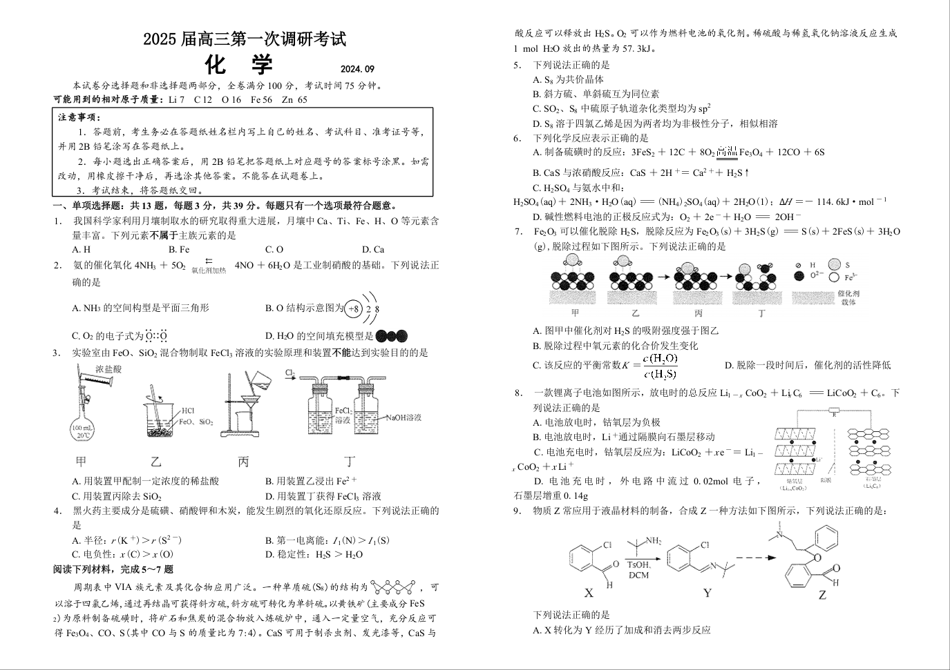 南通海门中学2025届高三上学期第一次调研考试+化学