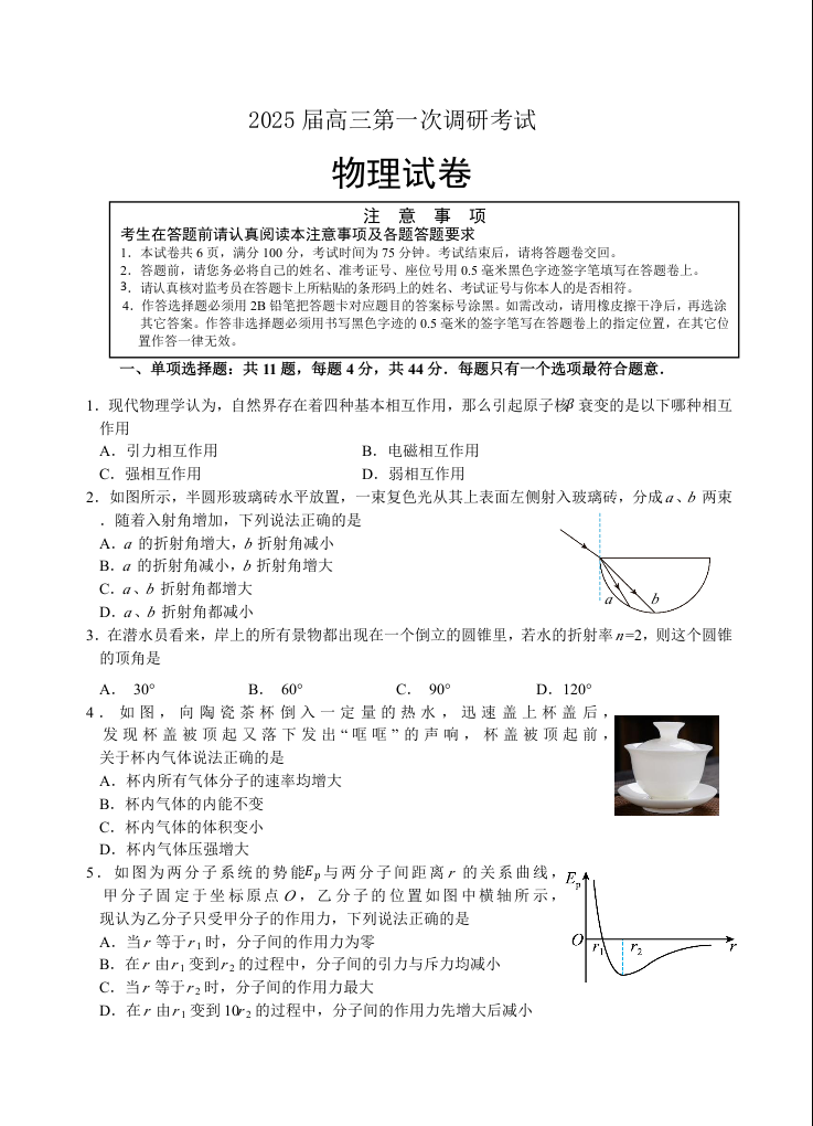 南通海门中学2025届高三上学期第一次调研考试+物理