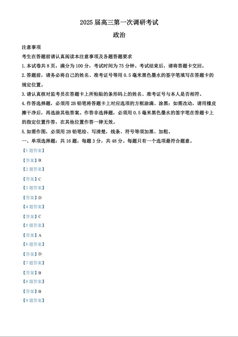 南通海门中学2025届高三上学期第一次调研考试+政治答案