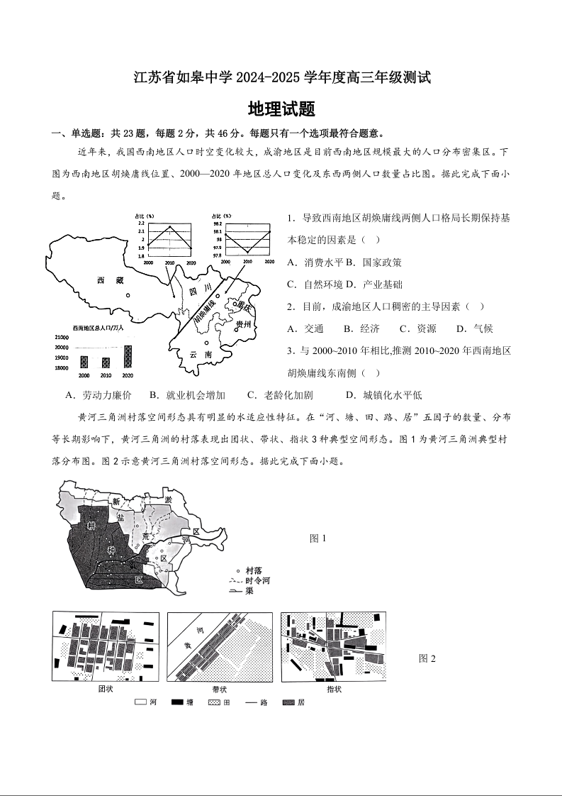 江苏省如皋中学2024-2025学年高三上学期综合练习(一)+地理